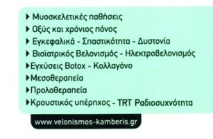 Ιατρικός Βελονισμός, Μεσοθεραπεία, Κρουστικός Έλεγχος,Στοχευμένες θεραπείες με ραδιοσυχνότητεςΔέχεται με ραντεβού